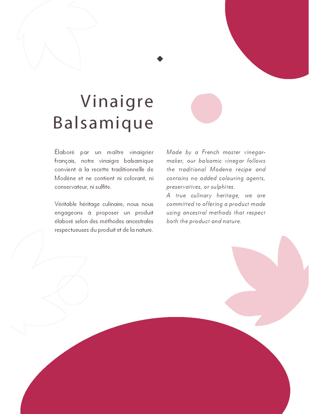 Bien qu’il soit produit en France, notre vinaigre balsamique s’inspire des méthodes traditionnelles de la région de Modène, en Italie, reconnue pour son vinaigre de vin balsamique de qualité.