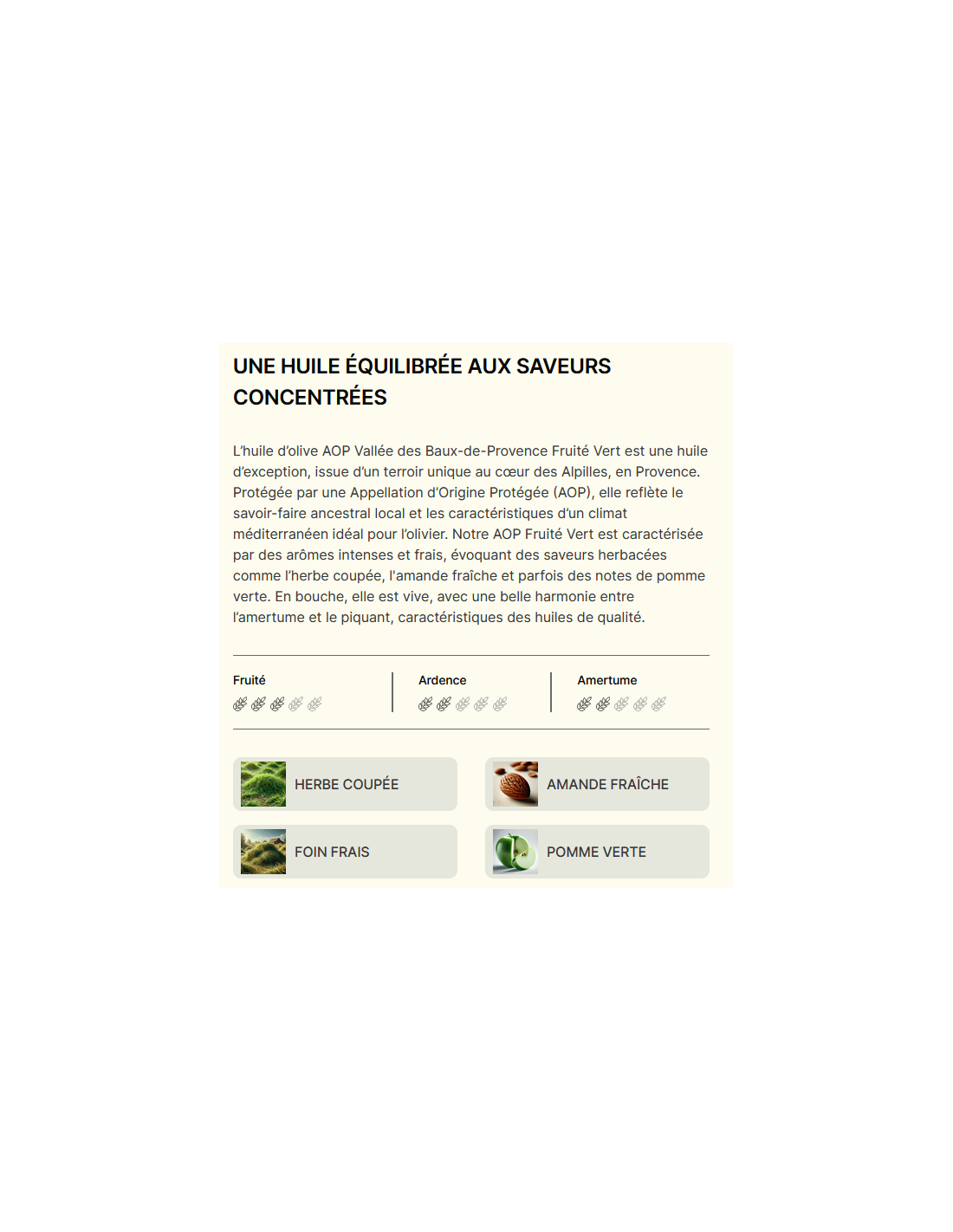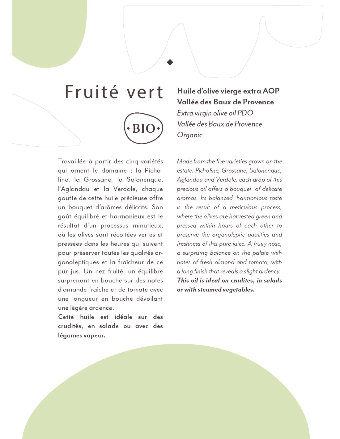 L’huile d’olive AOP Vallée des Baux-de-Provence Fruité Vert est une huile d’exception, issue d’un terroir unique au cœur des Alpilles, en Provence. Protégée par une Appellation d’Origine Protégée (AOP), elle reflète le savoir-faire ancestral local et les caractéristiques d’un climat méditerranéen idéal pour l’olivier. Notre AOP Fruité Vert est caractérisée par des arômes intenses et frais, évoquant des saveurs herbacées comme l’herbe coupée, l'amande fraîche et parfois des notes de pomme verte. En bouche, elle est vive, avec une belle harmonie entre l’amertume et le piquant, caractéristiques des huiles de qualité.