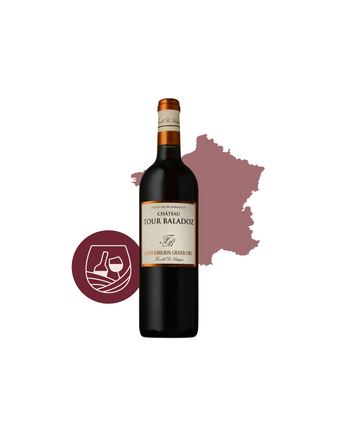 Château Tour BaladozLe merlot dominant procure au Château Tour Baladoz une robe sombre au bouquet marqué par les fruits rouges avec des nuances boisées et épicées. Vin corsé et rond en bouche qui dispose d’une belle structure évoluant vers une fraîcheur persistante.